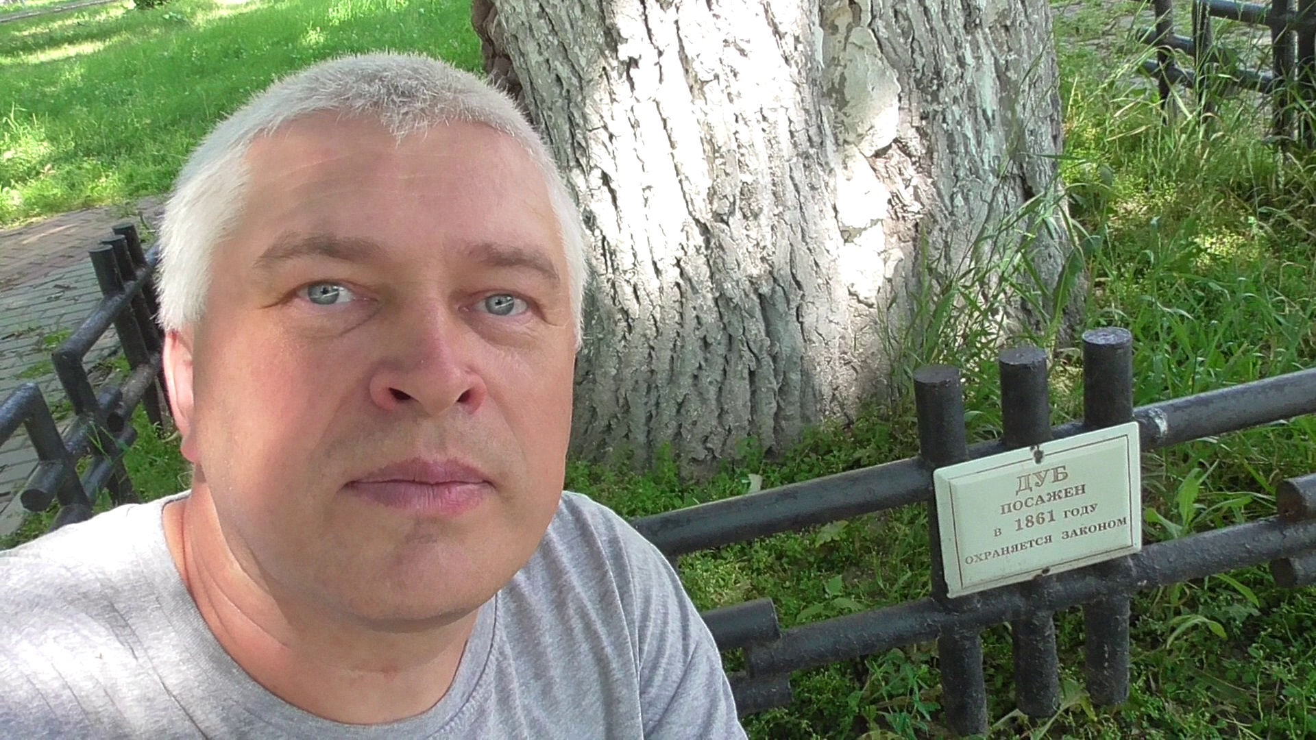 Геннадий Горин и дерево дуб. Дуб посажен в 1861 году охраняется законом. Бульвар Победы, город Орёл