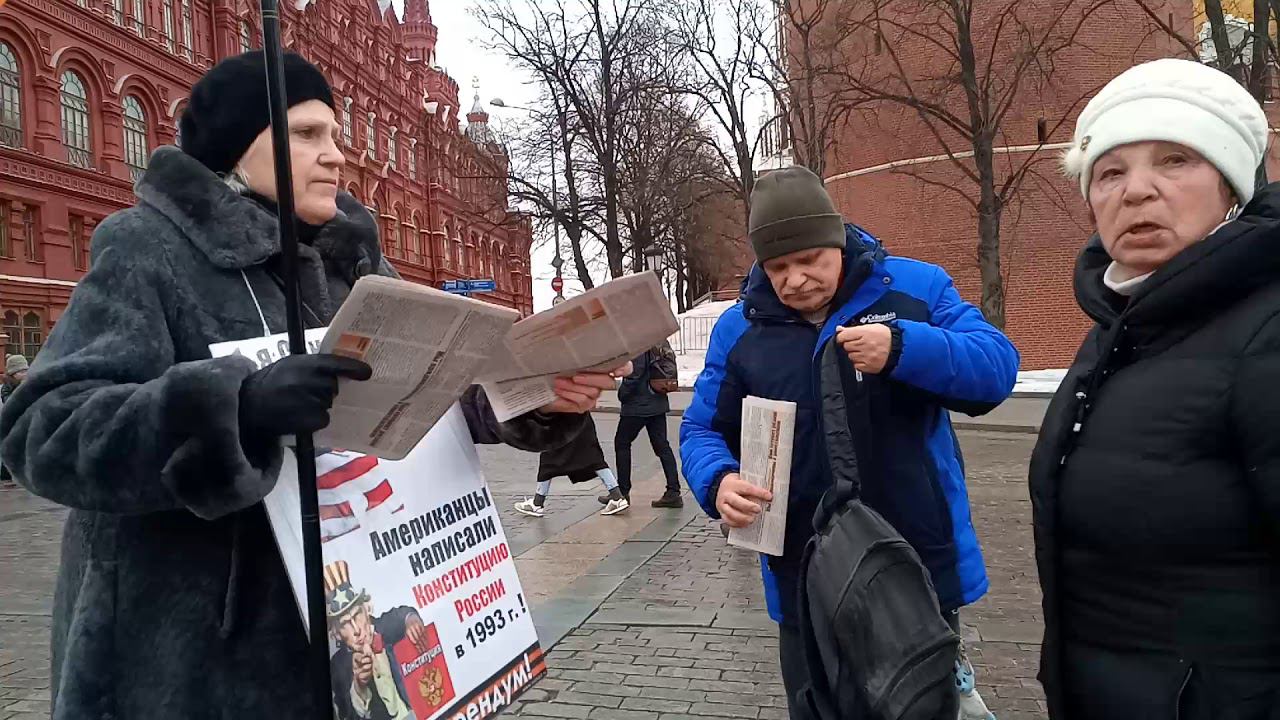 Москва. Пост № 1. Манежная Площадь. Одиночный информационный пикет участника Национально-Освободительного Движения (НОД). Ежедневно пикетчики Национально-Освободительного Движения рассказывают соотечественникам о правовой диверсии в нашей конституции о внешнем управлении государством и о начале сбора решений (подписей) граждан с 1 марта за проведение всенародного референдума по изменению статей 9.2 ; 13.2 и 15.4 нашей конституции, что позволит вернуть нам суверенитет России, утерянный в 1991-93 гг.
