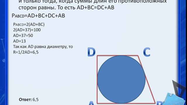 Периметр прямоугольной трапеции, описанной около окружности, равен 100, её большая боковая сторона равна 37. Найдите радиус окружности. В четырёхугольник ABCD вписана окружность, АВ - 8, ВС = 5 и CD = 27. Найдите четвёртую сторону четырёхугольника.