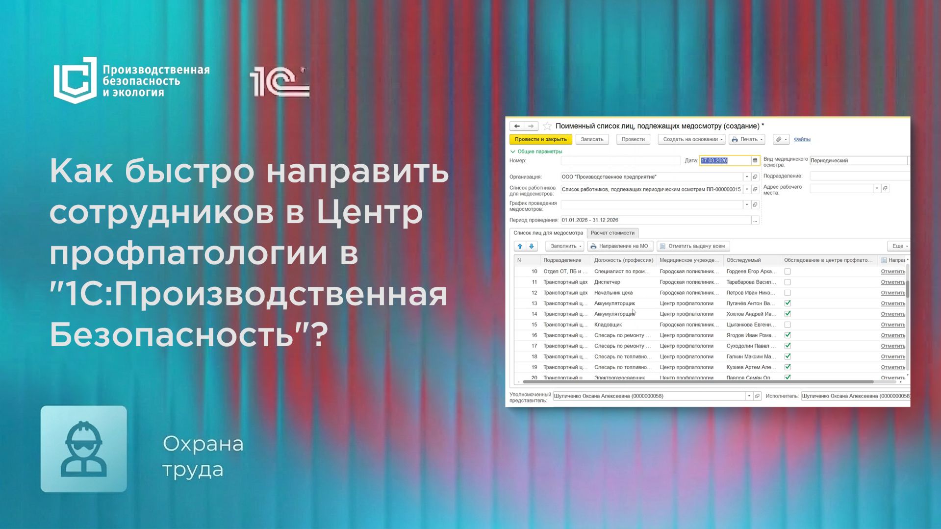 В этом видео мы покажем, как направить сотрудников на обследование в центр профпатологии в "1С:Производственная безопасность". Система сама находит сотрудников, которым пора проходить обследование, ставит отметку о направлении в Центр профпатологии и автоматически подтягивает медицинскую организацию, к которой они прикреплены. Вы полностью исключаете случайные ошибки при отборе сотрудников. Как сформировать список: 1️⃣ Перейдите в подсистему «Охрана здоровья» 👉 раздел «Подготовка к проведению». 2️⃣ Откройте «Списки работников, подлежащих периодическому осмотру» и создайте новый документ. 3️⃣ Заполните шапку документа, нажмите «Заполнить» 👉 «Заполнить список работников, подлежащих МО». Проведите документ. 4️⃣ На его основании создайте «Поимённый список лиц, подлежащих медосмотру». 5️⃣ В сформированном документе нажмите «Заполнить» и выберите «Заполнить список для обследования в Центре профпатологии».