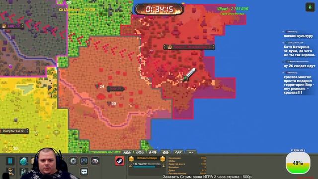Отправить ДОНАТ Бизарычу - https://www.donationalerts.com/r/bizarre Стрим на VKplay без лагов стрим - https://vkplay.live/bizarrejoy Стрим на ТВИЧЕ тут - https://www.twitch.tv/bizarejoy ТЕЛЕГРАММ канал с чатом Bizarre World - https://t.me/bizarreworld Группа в ВК - https://vk.com/bizarrejoy Ссылка на Правила, таблицу ТУРНИРА 3 сезон - https://clck.ru/37y2sd Интерактив (ДОНАТ), играем до ТОП 3 вы можете сделать следующее: НОВИНКА Крутануть Колесо ЗАДАНИЙ куча всего интересного - 30р ЗАСЕЛИТЬ СВОЮ СТРАНУ (ТОЛЬКО 1 Страна может быть куплена) ИНТЕРАКТИВ ОБНОВЛЕН, ЛЮДЕЙ ПОКУПАТЬ НЕЛЬЗЯ: Начальное БЕЗРАБОТНЫЙ дает Кофе, без имени, места, х10 чел - 30р Обычное РАБОТЯГА дает бодрящий Кофе, х1 Мир, х15 чел - 50р Бизнесмен ТОРГАШ дает Кофе х2 мир, х30 чел - 100р Богатый ОЛИГАРХ дает Благ и Кофе, х4 мира, х60 чел - 300р Мировая ЭЛИТА дает ВСЕ Бафы, х6 мир, х100 чел - 500р Космос МАСОНЫ дает ВСЕ бафы, х10 мир, х200 чел, отдельный остров - 1000р (Бесплатно из чата селю с 3-4 жителями рандомно после интерактива) ПЕРСОНАЖИ И ГОРОДА Назвать КОРОЛЯ вашим ИМЕНЕМ (без 18+ слов, ок?) - 20р Название Деревни вашим именем (деревня в племени) - 25р Сменить НАЗВАНИЕ своей страны, без мата - 26р БИОМ любой Трава, Джунгли, Лимоны, Конфеты, Алмазы - 41р Сменить название КЛАНА (Альянса) без мата - 51р Добавление скиллов, вещей и атрибутов Королю -Дать КОРОЛЮ способность (какая доступна) (1шт) - 10р (Бессмертие, Гигант, Сила, Мудрость, Гениальность, Регенерация и т.д.) ПОЛИТИКА (передача миров теперь 2к1) Объявление МИРА или ВОЙНЫ стране (ваша страна) - 80р Объявить МИР или ВОЙНУ между чужими странами - 150р Выбрать ЭПОХУ любую на ваш выбор, будьте осторожны - 101р Развалить АЛЬЯНС с союзными странами (свой) - 130р Развалить АЛЬЯНС с союзными странами (любой чужой) - 260р СВОБОДА (до топ 10) Восстание СТРАНЫ обретает свободу (страна_Х захваченная) - 499р (до топ 6 действие, ваше поселение на карте и название+мир) ПОМОЧЬ ПОСЕЛЕНЦАМ РЕСУРСАМИ (дают баф к развитию) Дать КАМЕНЬ, ЗОЛОТО, РУДА, АДАМАНТИЙ, СЕРЕБРО, МИФРИЛ - х1шт = 1р НАВРЕДИТЬ ПОСЕЛЕНЦАМ (после перемирия 30 минутного) Наслать МАГА-ЗЛА пускает огонь на жителей x1 - 100р Наслать НЕКРОМАНТА плодит скелетов х1 - 40р Наслать ДЕМОНА сильный монстр огневой х1 - 60р Атака животных Медведи, Волки, Носороги х1 - 25р Послать злых Бандитов, Холодоков, Снеговиков х1 - 50р ЧУДЕСА ДОБРЫЕ Напоить КОФЕ жителей ( +СКОРОСТЬ) !вся страна! КРОМЕ ВОЙНЫ - 25р Послать БЛАГОСЛОВЛЕНИЕ (дает СИЛУ) !вся страна! - 100р Наложить МОЩНОСИЛ на свою провку, сила Армии! МОщный БАФ - 100р Дать деревне ДРУИДА х5 защищает жителей, реген растений - 33р Дать жителям ДОБРОГО МАГА х3 защищает от ЗЛА (кроме Орков) - 50р Чумной ДОКТОР лечил БОЛЕЗНИ и ЗОМБИ ВИРУС - 55р Божественный ШАР защита всех жителей от урона (временно) - 60р Послать ЧУДО (ЛЕЧИТ - безумие, инфекции, болезни) !вся страна! - 154р ☔ ЧУДЕСА ЗЛЫЕ (после перемирия 30 минутного) ☔ Оживить ДЕРЕВЬЯ или ДОМА вредят людям !3-ая кисть! - 80р Удар МОЛНИИ ЗЕВСА все поджигает в месте удара - 90р Послать ТОРНАДО на деревню указать, все разрушает - 100р Наложить ПРОКЛЯТЬЕ на жителей (делает СЛАБЫМИ) - 111р Поставить ОГНЕННУЮ БАШНЮ сжигает все вокруг - 120р Поставить ЛЕДЯНУЮ БАШНЮ всех замораживает - 120р Наслать СУПЕР ТЫКВА плодит тыквы и очень Агрессивна - 122р АПОКАЛИПСИС (после перемирия 30 минутного) ГРАНАТА кинуть куда либо (кроме армии врага это читерно) - 35р Отправить НЛО в деревню указать какую - 170р Наслать ЗЕМЛЕТРЕСЕНИЕ все жители в ужасе - 180р Скинуть НАПАЛМ большой урон кисть (пожары) - 200р Отправить ДРАКОНА около д