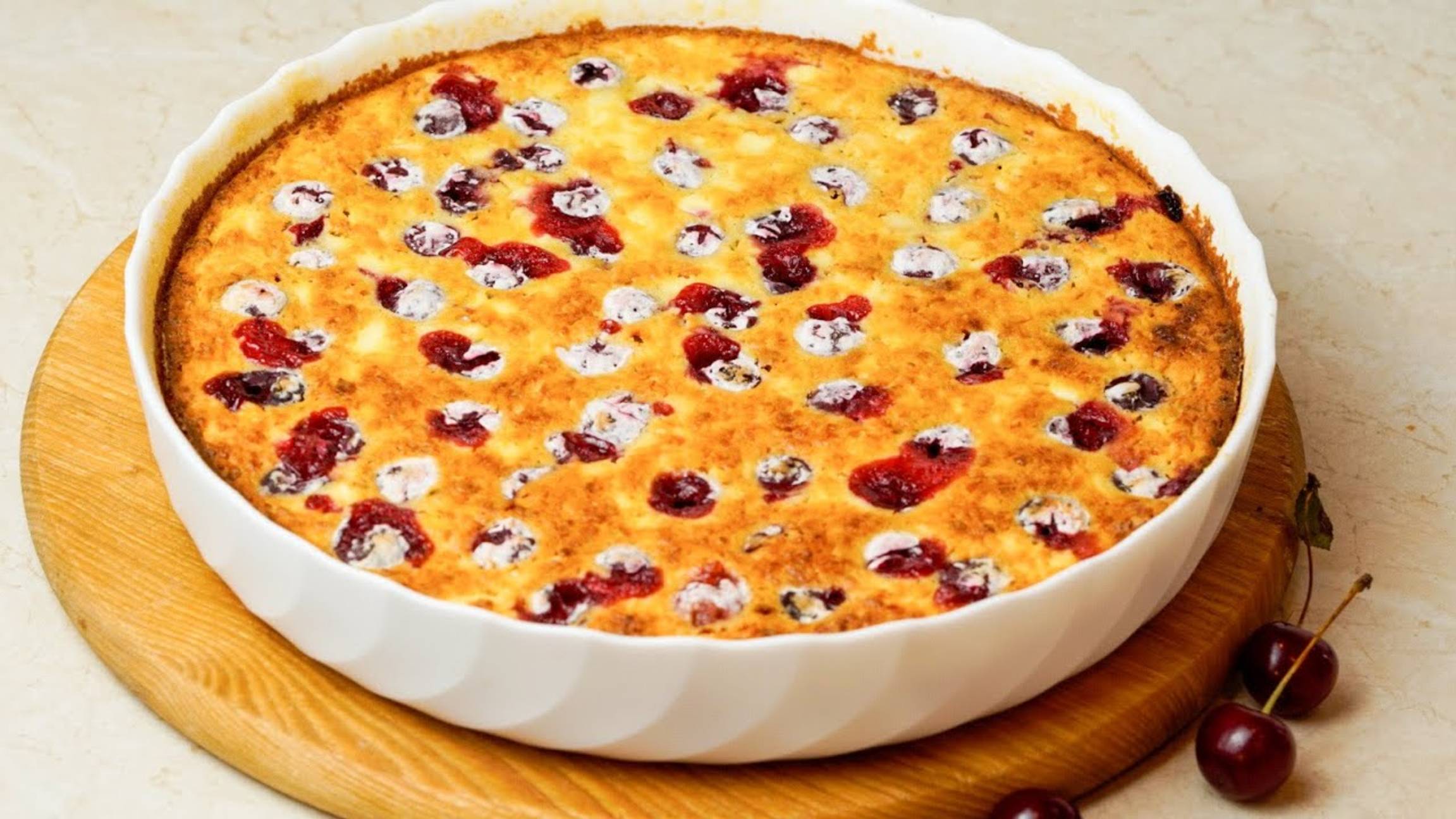 Творог -400 г Сахар -1 стакан (12ст.л.) Яйца -3 шт. Кукурузная мука -(манка, пшеничная мука)-3 ст. л. Сметана - 3 ст.л. Крахмал -1 ст.л. Разрыхлитель-1 ст. л. Соль- щепотка Ванильный сахар -1 ч.л. Вишня- 250 г Чтобы смазать форму -1ч.л. масла и муки Выпекать при t 190’ 45 минут (время зависит от вашей духовки).