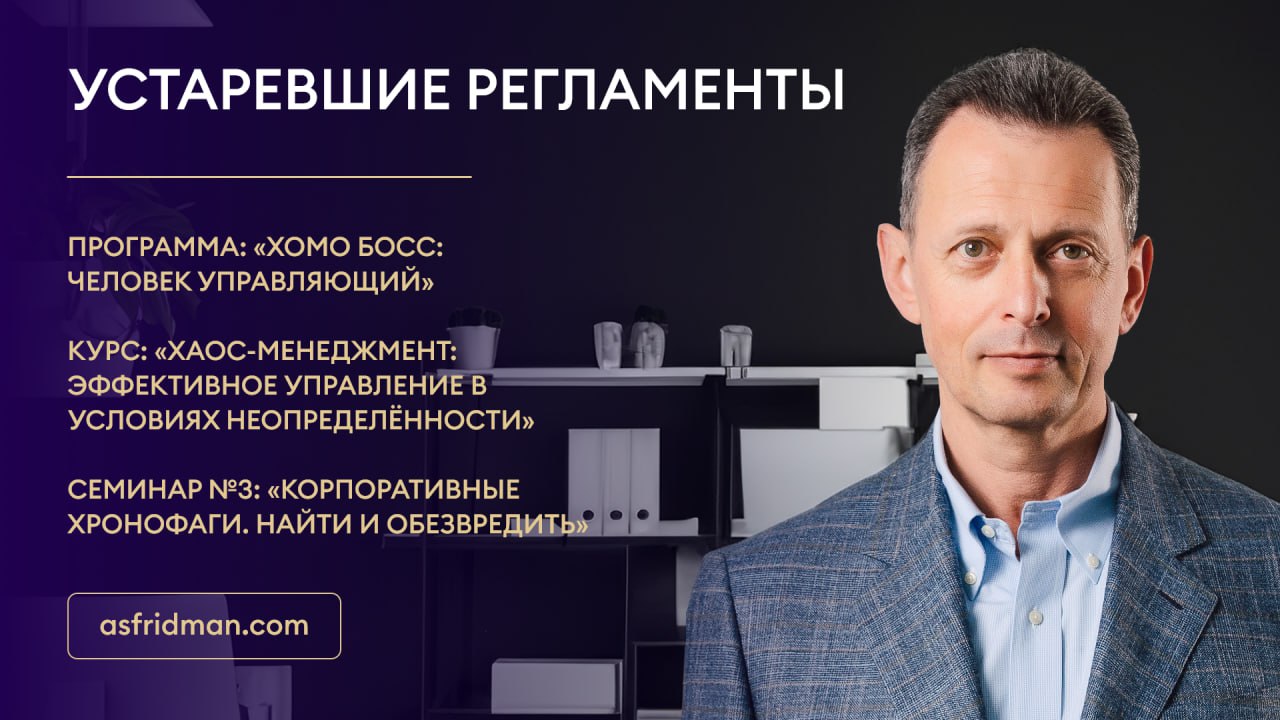 Устаревшие регламенты Программа: «Хомо Босс: Человек Управляющий» Курс: «Хаос-Менеджмент: Эффективное управление в условиях неопределённости» Семинар №3: «Корпоративные хронофаги. Найти и обезвредить» Расписание открытых семинаров Александра Фридмана: https://www.asfridman.com/raspisanie/
