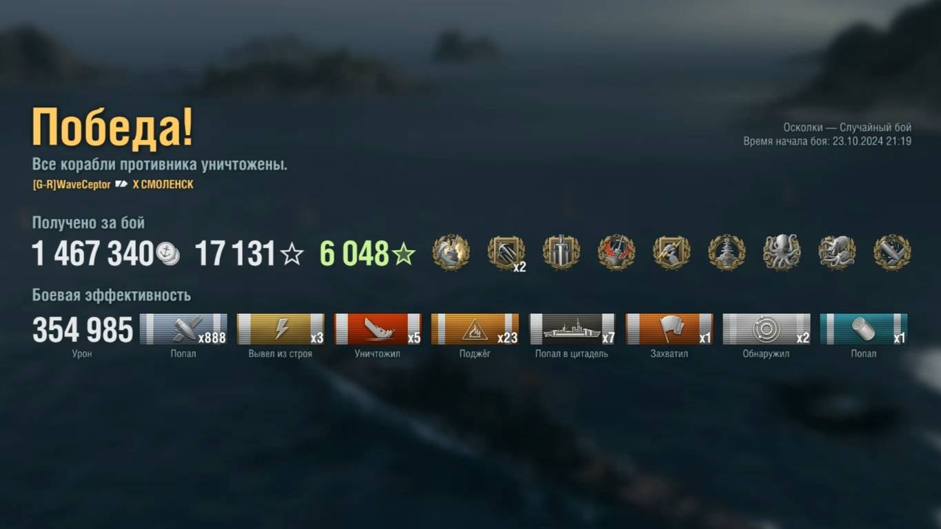 Крейсер Smolensk Игрок: WaveCeptor (EU) Карта: Осколки - Случайный бой Урон: 354к Smolensk- Крейсер СССР 10 уровня