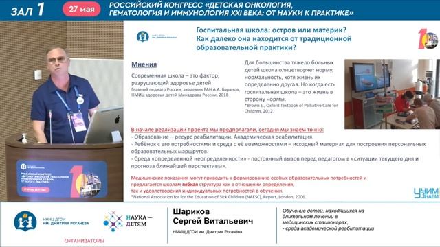 Руководитель проекта госпитальных школ России УчимЗнаем Сергей Витальевич Шариков . Доклад: «Обучение детей, находящихся длительном лечении в медицинских стационарах – среда академической реабилитации» на Российском конгрессе «Детская онкология, гематология и иммунология XXI века: от науки к практике».