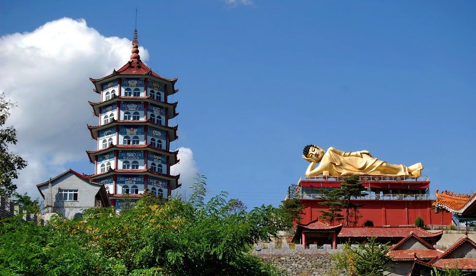 Храм Будды и монастырь Лин Бао. Храмовый буддийский комплекс Лин Бао был возведен более 300 лет назад на горе Бэйшань. Он была назван в честь даосской монахини Лин Бао. В мирской жизни, до ухода в монастырь, она была известной китайской ученой, обладающей феноменальными для того времени знаниями по истории и медицине. Лин Бао находится в очень живописном месте. На огромной территории комплекса в 90 тыс. м2 есть роща, большой пруд с рыбками, маленькое озеро с лотосами, обширные участки плоскогорья и горных массивов, покрытые зеленью. Будда, изображенный в такой нехарактерной для него позе, явление достаточно редкое. Лежачая поза была выбрана намеренно – для придания некой уникальности и привлечения внимания туристов. После открытия в Лин Бао были приглашены 30 настоящих китайских монахов. Они здесь живут, обслуживают всю территорию комплекса, проводят специальные ритуальные службы для туристов, продают сувениры. Китай, Яньбянь-Корейский автономный округ, Хуньчунь