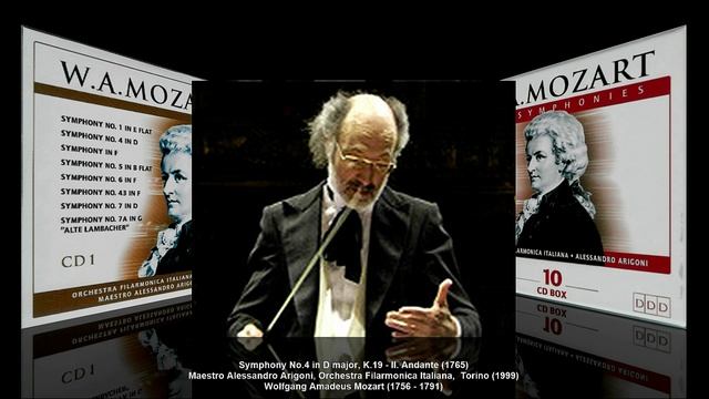 В.А. Моцарт. Все симфонии. Вып. 4-4 Wolfgang Amadeus Mozart (1756 - 1791) – Symphony No.4 in D major, K.19 (1765) Вольфганг Амадей Моцарт – Симфония №4 ре мажор, KV 19 (1765) D-dur ■ en re majeur ■ ре мажор 1. Allegro [2:42] 2. Andante {2:45] 3. Presto [1:40] Orchestra Filarmonica Italiana, Torino / Филармонический оркестр Италии, Торино Maestro Alessandro Arigoni / дир. Алессандро Арригони 1999 Симфония № 4 ре мажор, К.19, Вольфганга Амадея Моцарта была написана в Лондоне во время Большого тура семьи Моцарта по Европе в 1765 году, когда Моцарту было 9 лет. Несмотря на то, что оригинал рукописи Моцарта не сохранился, набор частей, написанный рукой его отца, Леопольда Моцарта, хранится в Баварской государственной библиотеке в Мюнхене. Сегодня известно, что ранние симфонии молодого Моцарта исполнялись на публичных концертах в театре Little Haymarket в Лондоне. Поэтому возможно, что эти части были написаны для одного из этих публичных выступлений, хотя Заслав приходит к выводу, что произведение было написано или, по крайней мере, завершено в Гааге. У симфонии три части, как это было принято в эпоху ранней классической музыки, в которой начинал писать Моцарт, в типичной быстрой-медленной-быстрой конфигурации. Они заключаются в следующем: 1. Allegro, D major, 4/4 (Common time), 78 bars 2. Andante, G major, 2/4 45 bars 3. Presto, D major, 3/8 106 bars