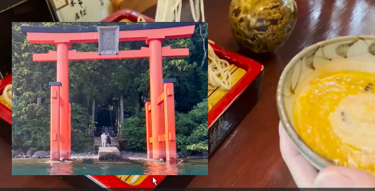 Поездка в Хаконе Япония . Озеро Аши . Тории синтоистские ворота и Фудзияма в дымке 5#