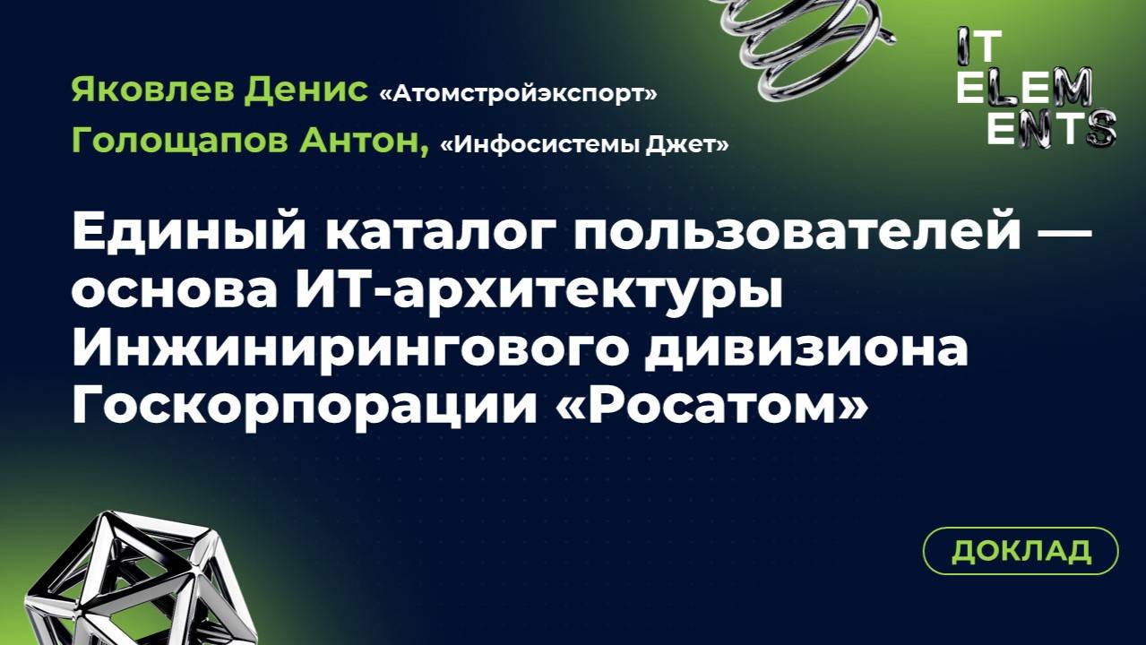 На IT Elements 2025 «Атомстройэкспорт» (инжиниринговый дивизион Росатома) и компания «Инфосистемы Джет» рассказали, как строят единый каталог пользователей на базе ALD Pro, уходя от Microsoft AD. В проекте — 15 000 рабочих мест, мобильные ЦОДы, строгие требования к безопасности и масштабируемости. Смотрите запись, чтобы узнать, как крупная госкорпорация проводит импортозамещение без остановки процессов. 01:30 - Чем занимается «Атомстройэкспорт» и цифровая стратегия Росатома 05:20 - Целевая ИТ-архитектура: корпоративные облака, опорные ЦОДы, мобильные площадки 09:10 - Почему единый каталог пользователей — ключ к управляемой инфраструктуре 13:00 - Выбор решения: критерии, пилотирование и тестирование ALD Pro 17:40 - Архитектура нового домена: доверительные отношения, интеграция с корпоративными системами 23:10 - Пошаговый план проекта: обследование, проектирование, пусконаладка 28:30 - Волны миграции: от тестовой группы до опытной эксплуатации 32:50 - Обучение персонала и рекомендации по планированию интеграции 36:00 - Ответы на вопросы, выводы и дальнейшие шаги