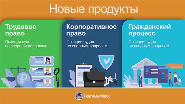 Новые продукты КонсультантПлюс для юриста: СС Позиции судов по спорным вопросам. Гражданский процесс СС Позиции судов по спорным вопросам. Трудовое право СС Позиции судов по спорным вопросам. Корпоративное право