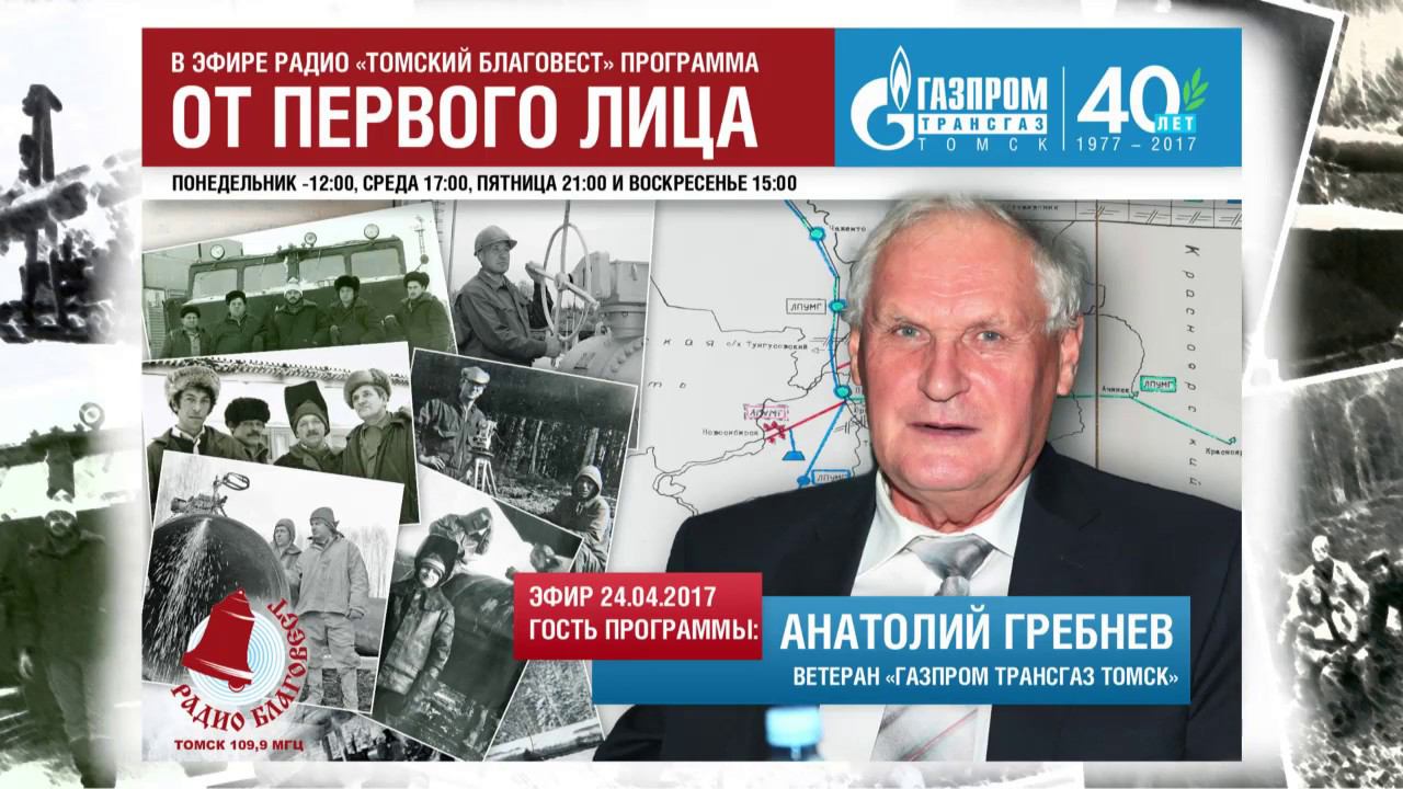 Анатолий Гребнев, ветеран "Газпром трансгаз Томск", в программе «От первого лица». Цикл программ посвящен 40-летию компании, в ней ветераны компании делятся своими воспоминаниями о том, как шло становление газовой отрасли, о романтике первопроходцев, о том, какие трудности приходилось преодолевать. Эфир с 24.04.2017 Программа выходит в эфир: Понедельник -12:00, среда 17:00, пятница 21:00 и воскресенье 15:00. Радио «Томский Благовест», слушайте на частотах: Томск - 100,9 МГц Асино - 101,5 МГц Мельниково - 100,5 МГц Понравилось видео? Подпишись на наш канал: http://www.youtube.com/channel/UCYSeimq6Dxto35syMvnnPaw ______________________________________________________ Официальный сайт: http://tomsk-tr.gazprom.ru/ ______________________________________________________ Сообщества в социальных сетях: "Вконтакте" - http://vk.com/gazpromtransgaztomsk "Facebook" - https://www.facebook.com/gazpromtransgaztomsk/ "Instagram" - https://www.instagram.com/gazpromtransgaztomsk/ " YouTube " - http://www.youtube.com/channel/UCYSeimq6Dxto35syMvnnPaw
