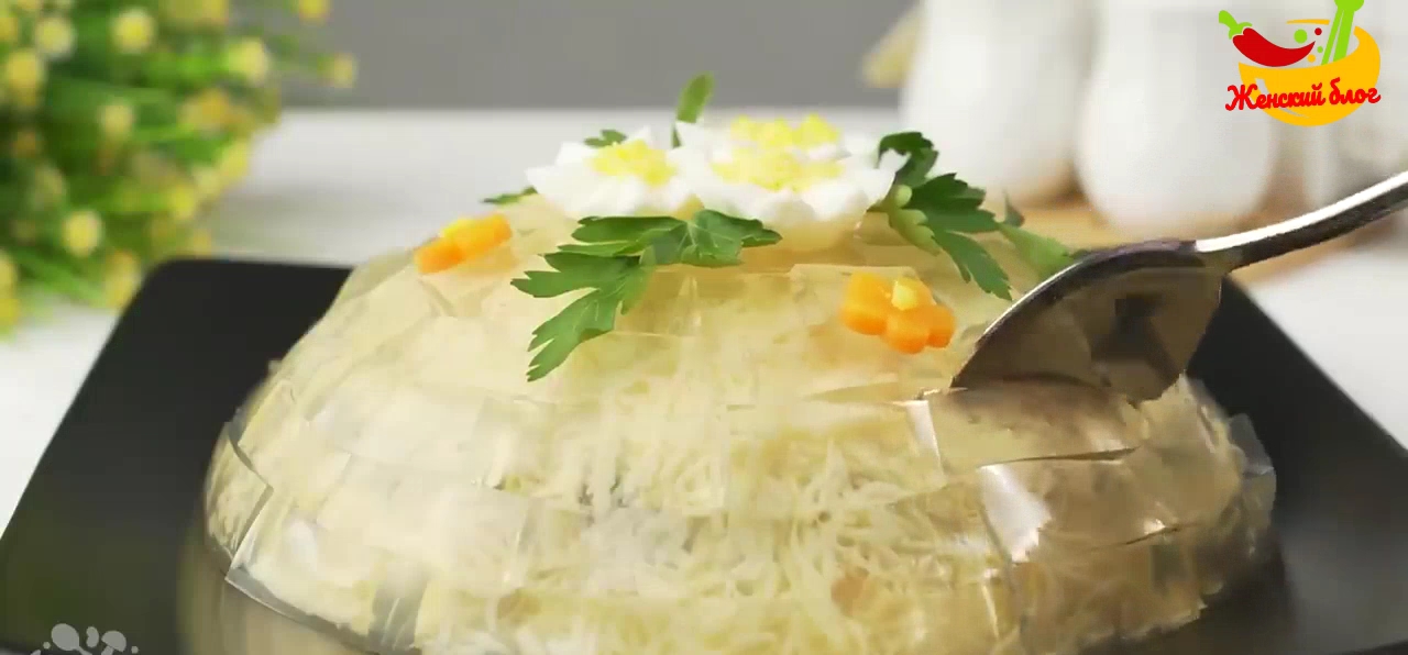 Салат Хрустальный. Красивый и необычный салат, который готовится из самых доступных продуктов. Такой красавец точно станет самым ярким украшением любого Праздничного стола. Готовится несложно и его сможет приготовить каждый. Удивите таким салатов своих родных и близких. ЛУЧШАЯ БЛАГОДАРНОСТЬ – подписка на канал ?, оценка видео ???, репост и комментарий! ИНГРЕДИЕНТЫ: филе индейки - 200 г шампиньоны - 200 г яйца - 3 шт. сыр - 100 г морковь отварная - 1 шт. лук - 1 шт. майонез - 100-150 г морковь (для бульона) - 1 шт. лук (для бульона) - 1 шт. лавровый лист - 1 шт. перец черный горошком - 2 шт. перец душистый горошком - 2 шт. перец черный молотый соль - по вкусу петрушка Желе: бульон - 500 мл желатин - 15 г