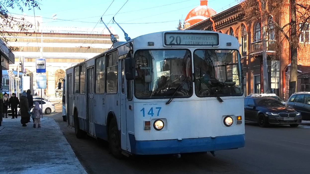 Троллейбус ЗиУ-682Г [Г00] борт. №147 маршрут №20 "Академическая - Ботаническая" следует через остановку "Центральная гостиница". Город Екатеринбург, Россия. Приписка: Октябрьское троллейбусное депо. 28.11.2022