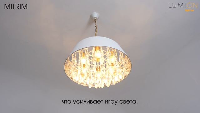 Линия MITRIM — это изысканное сочетание классики и современности, которое дизайнеры могут использовать для создания уютных и стильных интерьеров. Белый абажур из ткани и хрустальные подвески придают светильнику элегантность и легкость. Внутри абажур серебристо-зеркального цвета, что усиливает игру света, умножая его кратно. Благодаря своему дизайну, светильник становится центральным элементом комнаты. Он идеально подходит для столовых зон, гостиных или спален.