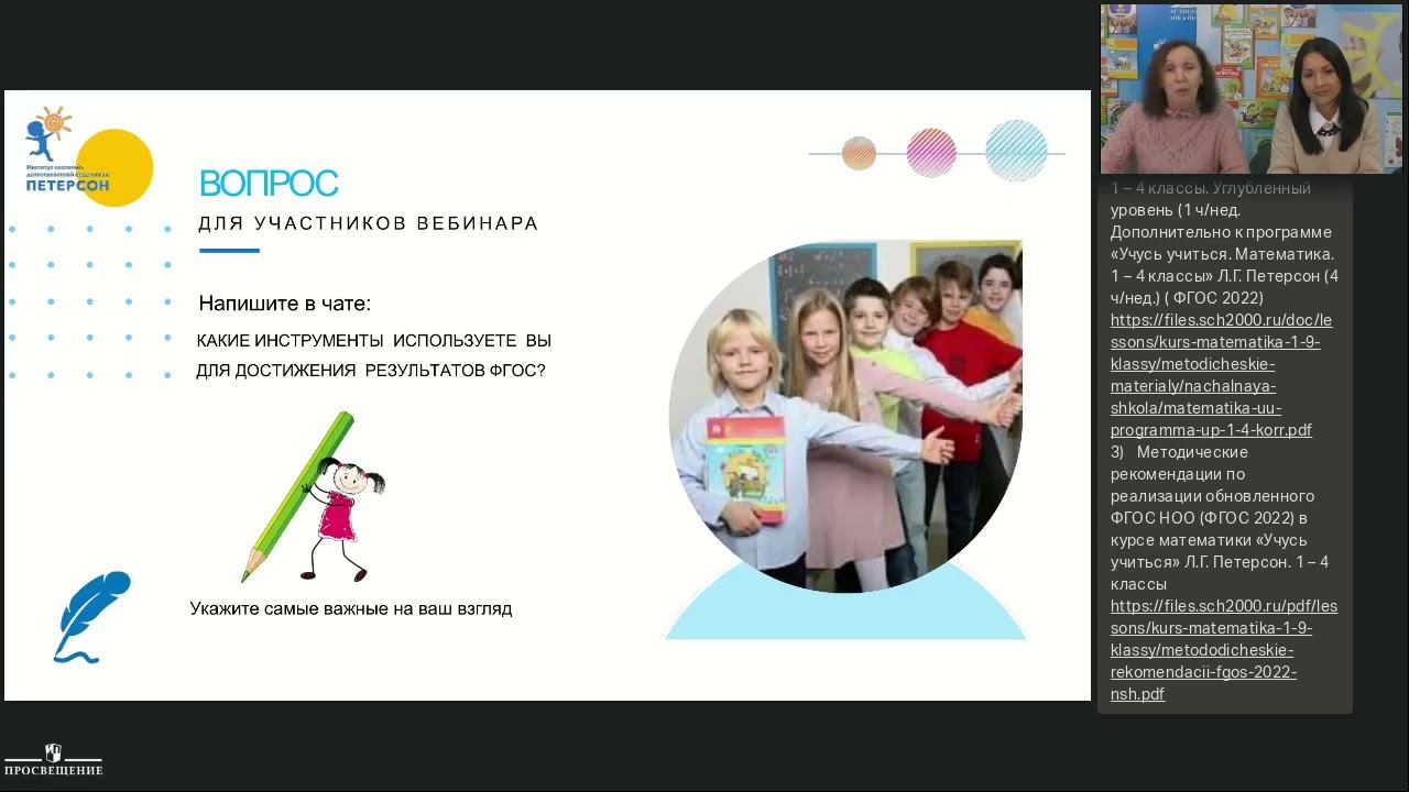 Возможности непрерывного курса математики «Учусь учиться» Л.Г. Петерсон (1─4 классы) для формирования учебной самостоятельности младшего школьника в условиях реализации новых ФГОС. Спикер - Гайдукова Валентина Ивановна, соавтор методических пособий по курсу математики «Учусь учиться», ведущий методист Института СДП