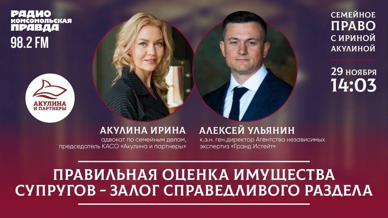 С какими сложностями и неожиданными поворотами можно столкнуться, если оценка имущества становится обязательной через суд ? Поговорим об этом в эфире @radiokp63 (https://m.vk.com/radiokp63) в программе «Семейное право с Ириной Акулиной», 29 ноября в 14:03. На актуальные вопросы зрителей ответит адвокат по семейным делам, председатель КАСО «Акулина и партнеры» (https://m.vk.com/id94396400) Ирина Акулина @id94396400 и генеральный директор агентства независимых экспертиз @grand_estate Алексей Ульянин @ulianin