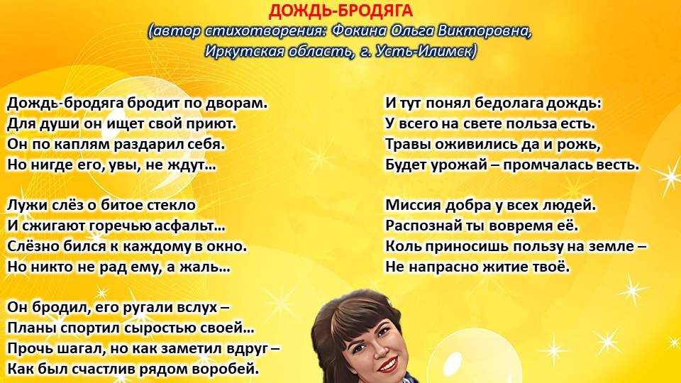 Читает автор стихотворения: ФОКИНА ОЛЬГА ВИКТОРОВНА (Иркутская область, город Усть-Илимск) СТИХИ: https://stihi.ru/2018/07/08/3790 БИОГРАФИЯ: http://www.proza.ru/2019/10/08/1473 ВЫИГРЫВАЙТЕ КНИГИ БЕСПЛАТНО: https://proza.ru/2017/09/17/447 ОТЗЫВЫ ЧИТАТЕЛЕЙ: http://www.proza.ru/2019/11/29/611 Из книги Фокиной Ольги Викторовны (Усть-Илимск) «Несу добро в ладошках!»: [все стихотворения с 2005 по октябрь 2020 гг., проза, авторские песни, интервью]. – Москва: МГО Союза писателей России, 2020 г. – 886 стр., ил. ISBN 978-5-7949-0826-8 ДОЖДЬ-БРОДЯГА (автор стихотворения: Фокина Ольга Викторовна, Иркутская область, г. Усть-Илимск) Дождь-бродяга бродит по дворам. Для души он ищет свой приют. Он по каплям раздарил себя. Но нигде его, увы, не ждут… Лужи слёз о битое стекло И сжигают горечью асфальт… Слёзно бился к каждому в окно. Но никто не рад ему, а жаль… Он бродил, его ругали вслух – Планы спортил сыростью своей… Прочь шагал, но как заметил вдруг – Как был счастлив рядом воробей. И тут понял бедолага дождь: У всего на свете польза есть. Травы оживились да и рожь, Будет урожай – промчалась весть. Миссия добра у всех людей. Распознай ты вовремя её. Коль приносишь пользу на земле – Не напрасно житие твоё. 19 сентября 2020 г. Стихотворение зарегистрировано на авторские права, поэтому его цитирование возможно только с указанием полного авторства: Фокина Ольга Викторовна (г. Усть-Илимск)