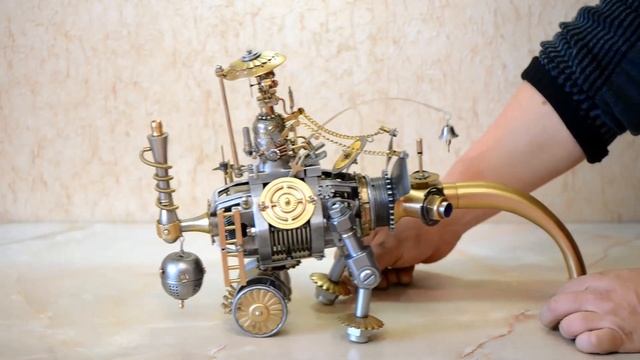 Полностью собран из готовых запчастей от различных механизмов, приборов и бытовых предметов. Ручная сборка, только болтовое и винтовое крепление, без клея и сварки. Фантастический рассказ и фото здесь: https://hunhuz71.livejournal.com/1901790.html