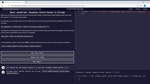 Basic JavaScript (23/111) | Escaping Literal Quotes in Strings | freeCodeCamp Full playlist ? https://www.youtube.com/watch?v=xBMb0KylHpI&list=PLH_87_56BLl12l-tU3coWK7Nhm1IMURJz When you are defining a string you must start and end with a single or double quote. What happens when you need a literal quote: " or ' inside of your string? In JavaScript, you can escape a quote from considering it as an end of string quote by placing a backslash (\) in front of the quote. var sampleStr = "Alan said, \"Peter is learning JavaScript\"."; This signals to JavaScript that the following quote is not the end of the string, but should instead appear inside the string. So if you were to print this to the console, you would get: Alan said, "Peter is learning JavaScript". https://www.freecodecamp.org/learn/javascript-algorithms-and-data-structures/basic-javascript/escaping-literal-quotes-in-strings