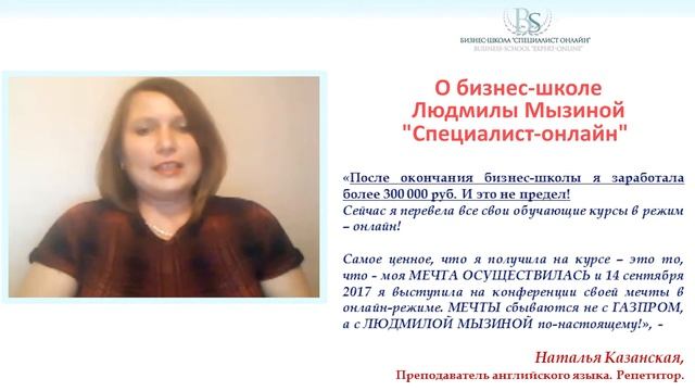Мнение о бизнес школе Л.Мызиной "СПЕЦИАЛИСТ ОНЛАЙН" выпускницы Натальи Казанской