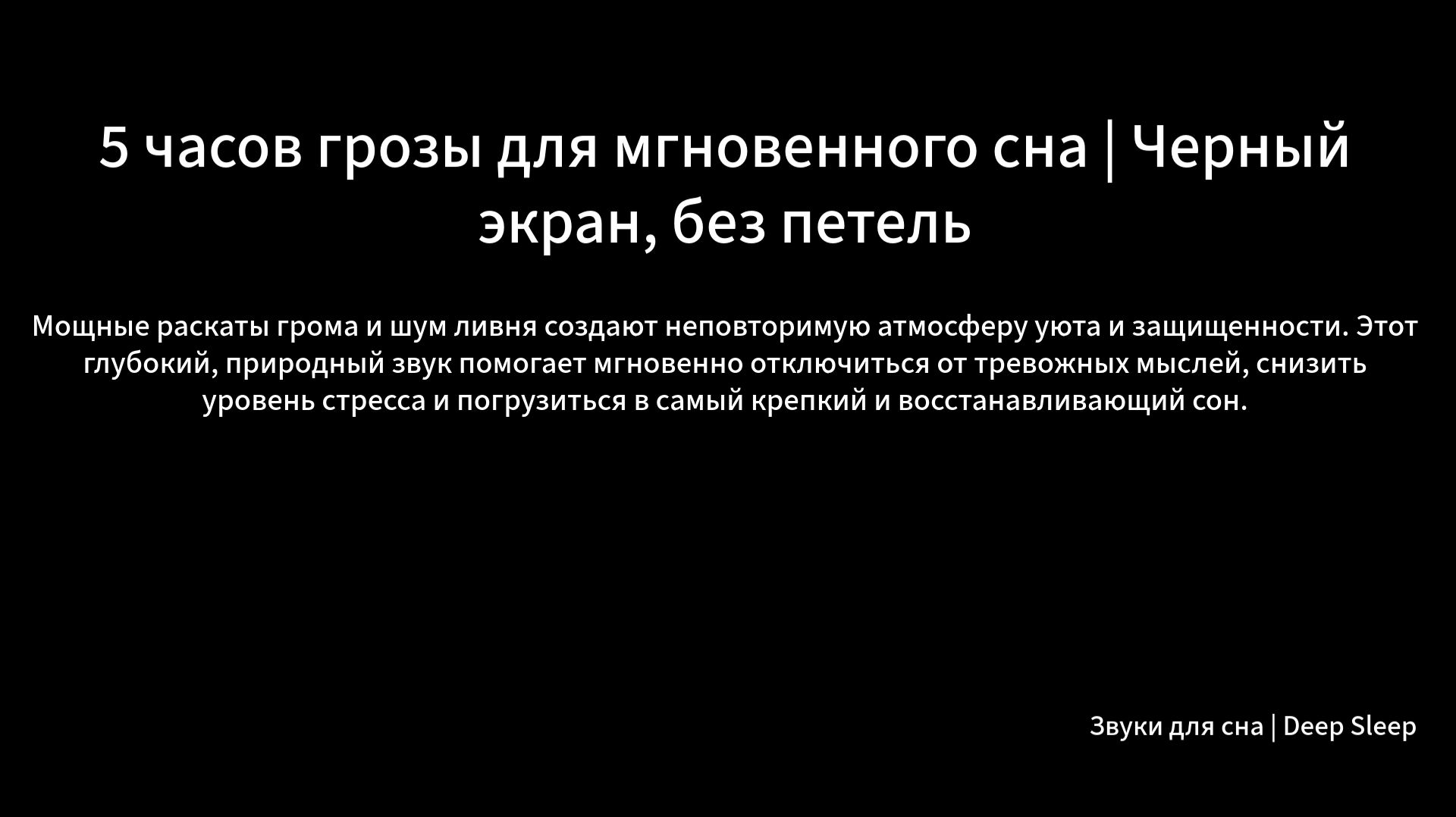 🌩️⚡ Мощные раскаты грома и шум ливня создают неповторимую атмосферу уюта и защищенности. Этот глубокий, природный звук помогает мгновенно отключиться от тревожных мыслей, снизить уровень стресса и погрузиться в самый крепкий и восстанавливающий сон. 🔹 Полная 5‑часовая версия с чёрным экраном, без петель и затуханий – только чистый, непрерывный звук грозы, который не прервёт ваш отдых. 📥 Если хотите слушать без рекламы и скачивать видео в высоком качестве, заходите на Boosty: https://boosty.to/deep_noise_sleep 🔹 Другие мои каналы: • YouTube (англоязычный): www.youtube.com/@Deep_Noise_Sleep • RuTube (русскоязычный): rutube.ru/channel/38738672/ • VK Видео (сообщество «Сон под шум | Deep Noise Sleep»): vkvideo.ru/@club236209856 Подписывайтесь на канал и пишите, любите ли вы засыпать под звуки грозы! 🌙 Евгений / Deep Noise Sleep Теги: гроза, звуки грозы, гром, дождь, для сна, мгновенный сон, 5 часов, глубокий сон, релаксация, белый шум, звуки природы, ливень, черный экран, без рекламы, скачать, thunderstorm, sleep instantly