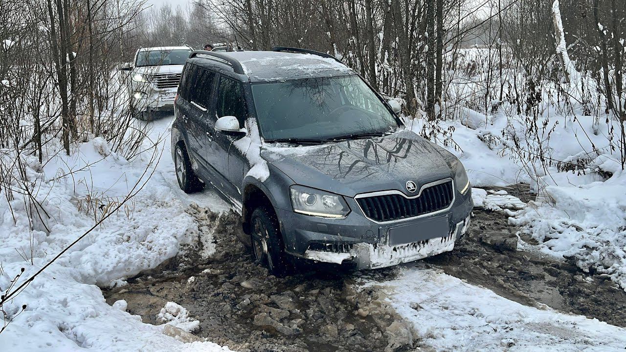 SKODA YETI, HUMMER H3, HAVAL H9 и MITSUBISHI PAJERO SPORT в зимнем лесу на разведке нового маршрута.