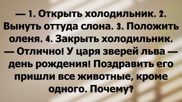 Анекдот про логику с неожиданной концовкой #анекдот Подписывайся https://t.me/gleb_shutilkin В универе идет экзамен по логике. Профессор: — На борту самолета 500 кирпичей. Один кирпич выпал из самолета. Сколько на борту осталось кирпичей? Студент: — 499! — Правильно. Следующий вопрос. Как поместить слона в холодильник в три приема? — 1. Открыть холодильник. 2. Поместить туда слона. 3. Закрыть холодильник. — Дальше. Как поместить оленя в холодильник в четыре приема? — 1. Открыть холодильник. 2. Вынуть оттуда слона. 3. Положить оленя. 4. Закрыть холодильник. — Отлично! У царя зверей льва — день рождения! Поздравить его пришли все животные, кроме одного. Почему? — Потому, что олень все еще находится в холодильнике. — Великолепно! — говорит профессор. — Пойдем дальше. Может ли бабуля пройти через болото с крокодилами? — Конечно, может! Ведь все крокодилы ушли праздновать день рождения льва. — Хорошо! А теперь последний вопрос. Бабуля прошла через пустое болото, но все равно умерла. Что с ней случилось? — Э-э-э Может быть, сердечный приступ? — А вот и нет! Через недельку, голубчик, прийдете ко мне на пересдачу!.. На нее упал кирпич, который, как вы помните, выпал из самолета.