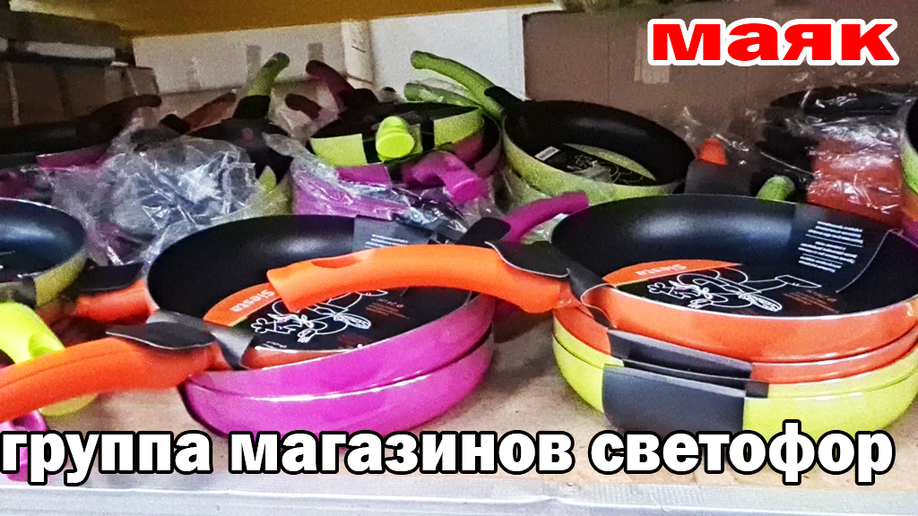 Группа магазинов СВЕТОФОР МАЯК.Огромное количество сковород.Без покупки не ушла.Купила сыр и колбасу
