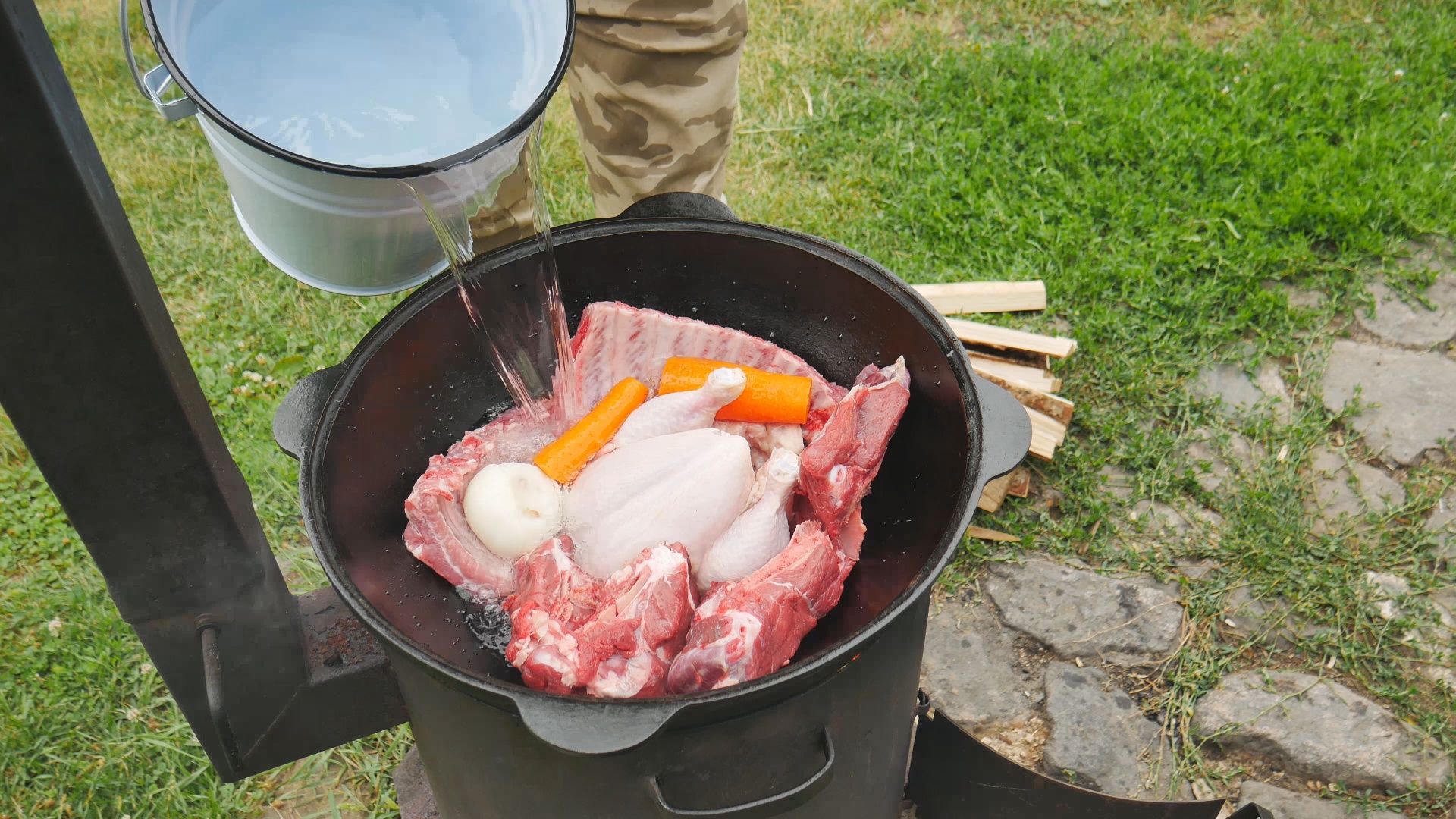 Боярские щи из трех видов мяса в казане на костре.
