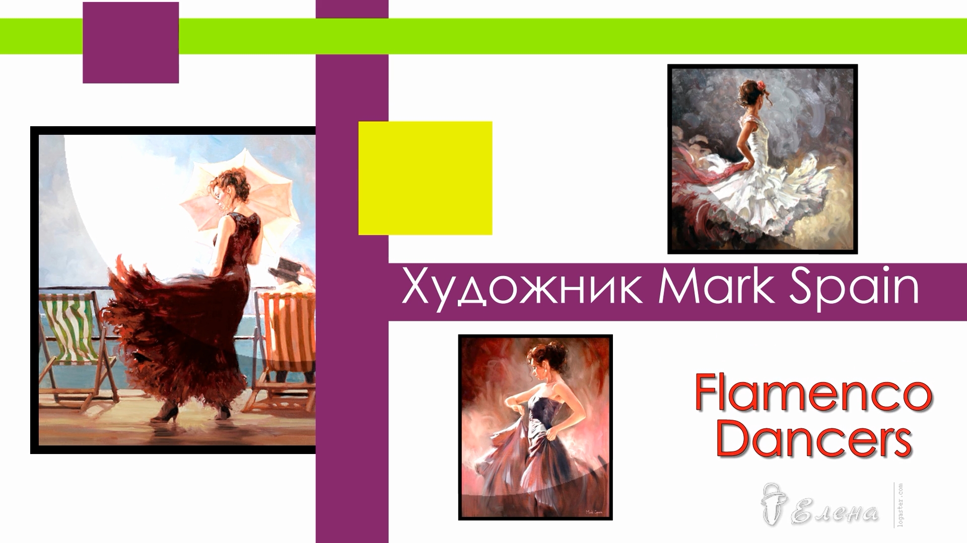 ***** Марк Спейн (Mark Spain) – энергичный и талантливый английский художник. Технической графике Mark Spain обучался в колледже искусств в Медуэй ( Medway College of Art), после чего стал создавать удивительные работы в студии графства Кент. Mark Spain любил экспериментировать с различными предметами и методами, создавая свои восхитительные картины. Работы художника выставлялись на многочисленных выставках, включая выставки в знаменитых галереях Челси (Chelsea) и Хэмптон-Корт (Hampton Court). В настоящее время, работы известного художника Марка Спейна находятся у коллекционеров со всего мира и выставляются в галереях по всей Великобритании. В работах, приведённых ниже, Mark Spain искусно отражает женскую красоту и очарование, передает атмосферу, дух и настроение, улавливает прекрасные моменты женского обаяния во время танца... *****Страсть моя закружит меня в ритме фламенко , гордо голову вскинет и бедром поведёт. Танец страсти танцую. И , подняв над коленкой , юбкой алой рисую для тебя лишь намёк . Ноги дроби стучат , с кастаньетами споря , зажигая в глазах яркой искры пожар. Я танцую фламенко, жаркой тайной во взоре , обещая смотрящим сладострастный кошмар ... Неотрывно следи за движеньями танца-это всё для тебя ! Взгляд , лица поворот - это магия тела , пребывающей в трансе , танцовщицы фламенко неуёмный полёт ! Музыка Tigris Palace Novamenco (Испанская гитара в стиле Фламенко) Видеомонтаж Елены Короед Для просмотра и прослушивания с наилучшим изображением и звуком выставляем на шестеренке справа внизу настройку 1080р .................................................................................................................................