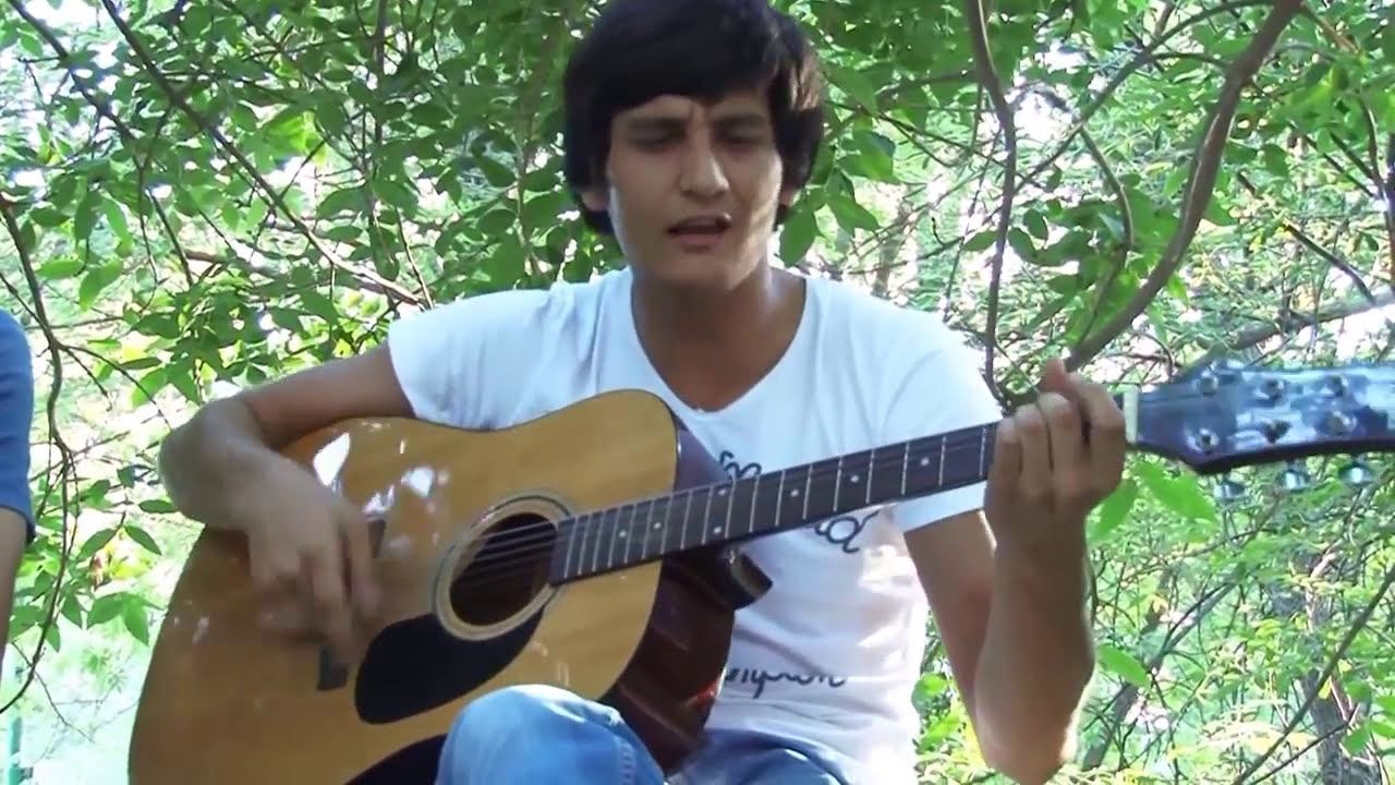 Карим поет на гитаре в парке в городе Кизляре летом 2014 год