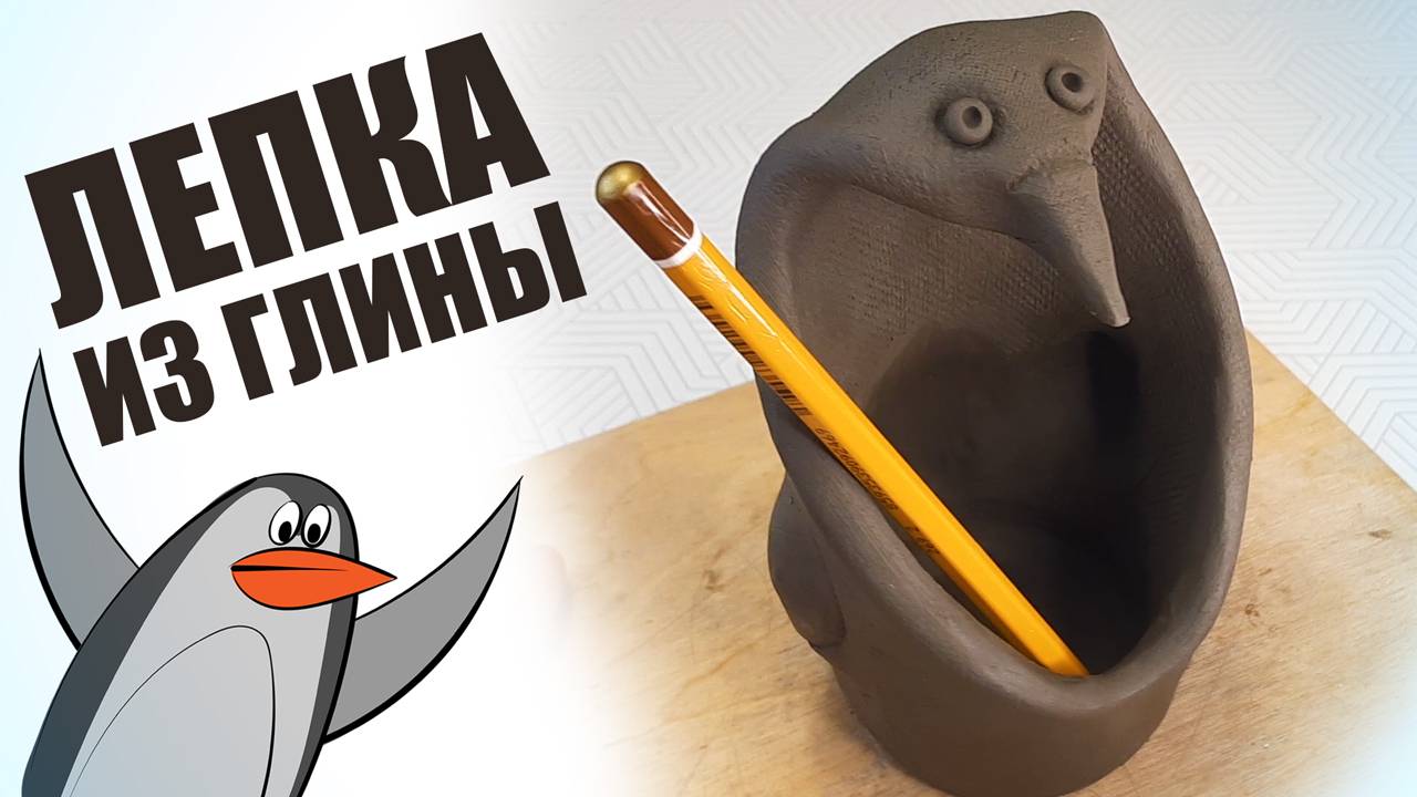Лепка из природной глины. Как слепить карандашницу. Пингвин. В продолжение темы лепки из глиняного пласта. В этом видео вы сможете увидеть некоторые полезные приемы работы с пластом, чтобы потом слепить также или придумать что-то свое. Основное отличие от обычной лепки в том, что форму поделки мы получаем используя выкроенные из пласта фигуры, изгибаем и склеиваем их. Стараясь при этом передать характерные черты, в нашем случае пингвина.