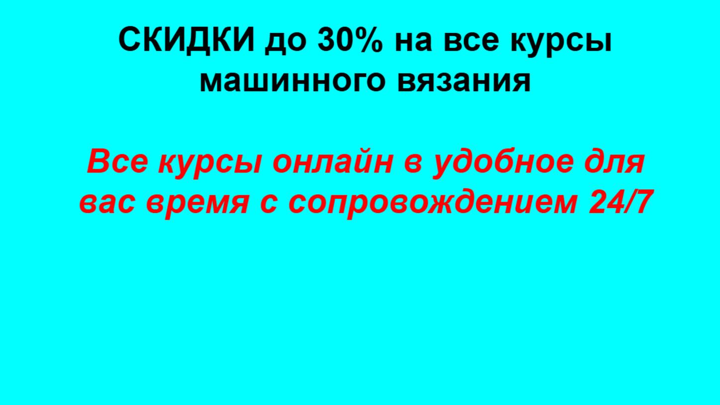 Всем привет! С вами Анна Амелина ❤️Всем привет! 😘Начинаю очередной набор на курсы по машинному вязанию ✅Все курсы проходят в закрытых каналах телеграм, курсы уже записаны, оплачиваете и проходите по ссылке. ✅Обучение проходит не в определенные дни, а в том темпе, в котором вам удобно ✅Отвечаю всегда в режиме 24//7, перерыв только на сон😜 Курс НОВИЧОК цена курса 8 000 рублей (Курс для самостоятельного обучения) Подробнее о курсе ЗДЕСЬ (https://vk.com/market/product/kurs-mashinnogo-vyazania-quotnovichokquot-bez-soprovozhdenia-81506385-12936855) ‼️‼️‼️Но для вас у меня есть интересное предложение‼️‼️‼️ ✅Для тех, кто оплатит курс до 7 сентября скидка 30% всего за 5600 рублей ✅Для тех, кто оплатит курс с 8 до 11 сентября скидка 20% всего за 6400 рублей ✅Для тех, кто оплатит курс с 12 до 15 сентября скидка 10% всего за 7200 рублей Курс С НУЛЯ ДО КАРДИГАНА цена курса 14 000 рублей (Курс с полным сопровождением) Подробнее о курсе ЗДЕСЬ (https://vk.com/market/product/kurs-mashinnogo-vyazania-quots-nulya-do-kardiganaquot-81506385-12936871) ‼️‼️‼️Но для вас у меня есть интересное предложение‼️‼️‼️ ✅Для тех, кто оплатит курс до 7 сентября скидка 30% всего за 9800 рублей ✅Для тех, кто оплатит курс с 8 до 11 сентября скидка 20% всего за 11200 рублей ✅Для тех, кто оплатит курс с 12 до 15 сентября скидка 10% всего за 12600 рублей Курс ВТОРАЯ ФОНТУРА цена курса 16 000 рублей (Курс с полным сопровождением) Подробнее о курсе ЗДЕСЬ (https://vk.com/market/product/kurs-mashinnogo-vyazania-quotvtoraya-fonturaquot-81506385-12936905) ‼️‼️‼️Но для вас у меня есть интересное предложение‼️‼️‼️ ✅Для тех, кто оплатит курс до 7 сентября скидка 30% всего за 11200 рублей ✅Для тех, кто оплатит курс с 8 до 11 сентября скидка 20% всего за 12 800 рублей ✅Для тех, кто оплатит курс с 12 до 15 сентября скидка 10% всего за 14 400 рублей Курс УЧИМСЯ РАСЧЕТАМ ПЛЕЧЕВЫХ ИЗДЕЛИЙ цена курса 12 000 рублей (Курс с полным сопровождением) Подробнее о курсе ЗДЕСЬ (https://vk.com/market/product/kurs-quotuchimsya-raschetu-plechevykh-izdelijquot-81506385-12936915) ‼️‼️‼️Но для вас у меня есть интересное предложение‼️‼️‼️ ✅Для тех, кто оплатит курс до 7 сентября скидка 30% всего за 8400 рублей ✅Для тех, кто оплатит курс с 8 до 11 сентября скидка 20% всего за 9600 рублей ✅Для тех, кто оплатит курс с 12 до 15 сентября скидка 10% всего за 10800 рублей ✅Успевайте!!!✅ Приобрести можно написав мне по реквизитам ниже (у меня нет помощников и администраторов) Мой канал в телеграм по вязанию на машине https://t.me/mash_vyaz Мой канал в телеграм по вязанию на спицах и крючком https://t.me/vjazaniedljavas Я в телеграм @anna_amelina Я вконтакте https://vk.com/annavayzanie Я в ОК https://www.ok.ru/profile/577589426180 Ватцап/вайбер +79964271190 #курсымашинноговязания #обучениемашинномувязанию #учимсявязатьнамашине #вязаниенамашине