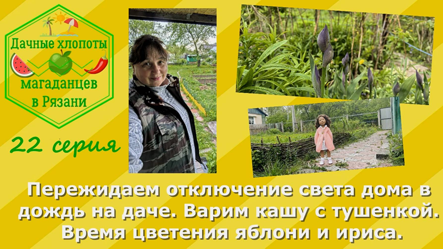 Пережидаем отключение света дома в дождь на даче. Варим кашу с тушенкой. Цвете яблоня и ирисы