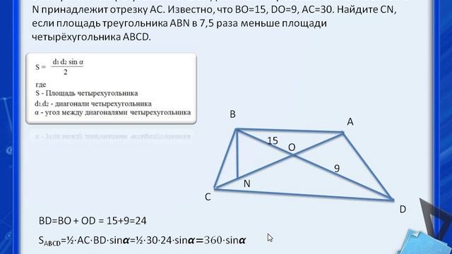 В выпуклом четырёхугольнике ABCD диагонали пересекаются в точке O. Точка N принадлежит отрезку AC. Известно, что BO=15, DO=9, AC=30. Найдите CN, если площадь треугольника ABN в 7,5 раза меньше площади четырёхугольника ABCD.