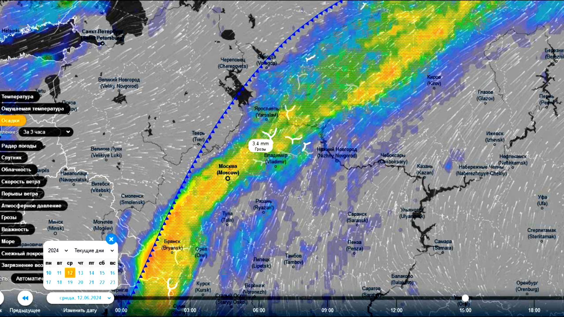 Рекордные осадки в малоподвижном фронте над ЕТР ожидаются с 11 по 14 июня. Прогноз погоды