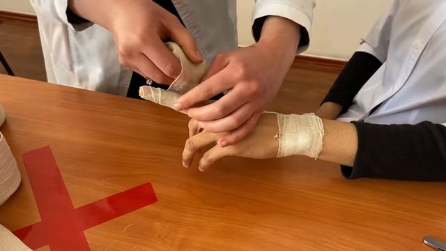 Техника наложения спиральной повязки на средний палец.