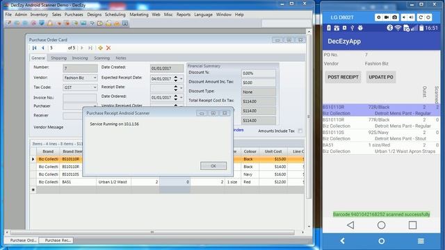 This tutorial demonstrates how to use an android device and bluetooth barcode scanner to assist with receiving purchase orders into DecEzy