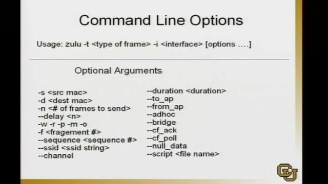 Damon McCoy: Zulu a Command Line Wireless Frame Generator Abstract: Zulu is a light weight 802.11 wireless frame generation tool to enable fast and easy debugging and probing of 802.11 networks. It has an intuitive command line interface and operates with the unmodified madwifi-ng and partially with prism based Linux network drivers. Individual fields in frames can be set or unset, generating frames that possibly violate the IEEE 802.11 protocol. It can generate all control, data, and management frame types and subtypes. The user-friendly command line options enable novice users to quickly generate custom frames with a combination of values placed in different frame fields. Zulu is freely available under the GNU license. Bios: Damon McCoy has worked in a variety of industry and government positions. Currently he is a Doctoral Candidate in the Department of Computer Science at the University of Colorado at Boulder. He has also worked at Sandia National Laboratories in the Center for Cyber Defenders. Prior to this he worked for IBM in the Emergency Response Services group as a network security consultant. Before this he worked for both AT&T Research and Lucent Bell Laboratories. Anmol Sheth is a Doctoral Candidate in Computer Science at the University of Colorado at Boulder. He received his B.S. in Computer Science from the University of Pune, India in 2001. His research interests include MAC layer protocol design, fault tolerant distributed wireless systems and energy- efficient wireless communication.