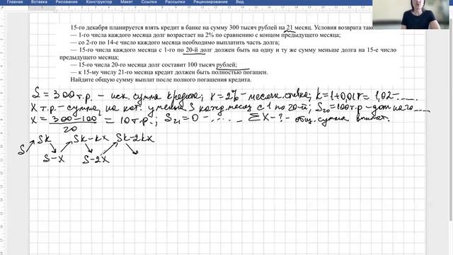 ЭКОНОМИЧЕСКАЯ ЗАДАЧА ДОСРОК 22. Привет, хорошие мои ❤️❤️❤️. Сегодня разберём экономическую задачу, подобную той, которая попалась мне в варианте досрочного егэ 2022 (жду с трепетом его результаты). Эта задача была в основной волне егэ 2018, она же в резерве 2018 и затем в резерве 2021. Дифференцированные платежи с отличным последним платежом. Условие задачи 15-го декабря планируется взять кредит в банке на сумму 300 тысяч рублей на 21 месяц. Условия возврата таковы: — 1-го числа каждого месяца долг возрастает на 2% по сравнению с концом предыдущего месяца; — со 2-го по 14-е число каждого месяца необходимо выплатить часть долга; — 15-го числа каждого месяца с 1-го по 20-й долг должен быть на одну и ту же сумму меньше долга на 15-е число предыдущего месяца; — 15-го числа 20-го месяца долг составит 100 тысяч рублей; — к 15-му числу 21-го месяца кредит должен быть полностью погашен. Найдите общую сумму выплат после полного погашения кредита #набюджет #репетиторматематики #репетиторегэонлайн #математичка #матан #вступительныеэкзамены #экзамены2022 #егэ2023