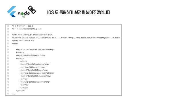 안드로이드 및 아이폰 설정에 등록한 스키마와 HTML 의 주소를 보시면 활용하실 수 있습니다 ? * Flutter SDK : 2.0.3 Stable * NodeJS : 14.15.0 LTS * Preview : https://youtu.be/X53gz1ulx2w * Code : https://gist.github.com/doyle-flutter/8b4f99b05b2e8d0cd28f2ae64e906e21 * 커뮤니티 카페 : https://cafe.naver.com/flutterjames * 오프라인 수업 : https://taling.me/Talent/Detail/10726
