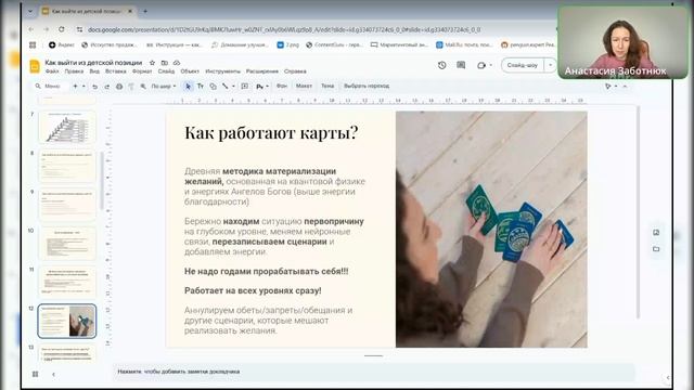 Разобрали темы: 🔸Как понять, что вы «провалились» в детскую позицию? 🔸Какие выгоды есть у этого? 🔸Что мешает выйти из детской позиции во взрослую и зарабатывать больше? 📍Проработали на ангельской карте историю выхода из детской позиции Нашли у одной из участниц сценарий «проявляться в удовольствие = смерть» и проработали в моменте. 👉 Вы можете проработать по записи с картой. А можете за месяц со мной убрать то, что мешает и выстроить фундамент в голове и продажах. Все это в групповом формате работы «Деньги в потоке» . _______________ Приходите на открытые разборы в тг канале: 👉 https://t.me/gravityaz Комьюнити сильных экспертов: https://t.me/+fcmNG-PGYfA5NDcy Написать мне в телеграм https://t.me/nastyazabotnyuk