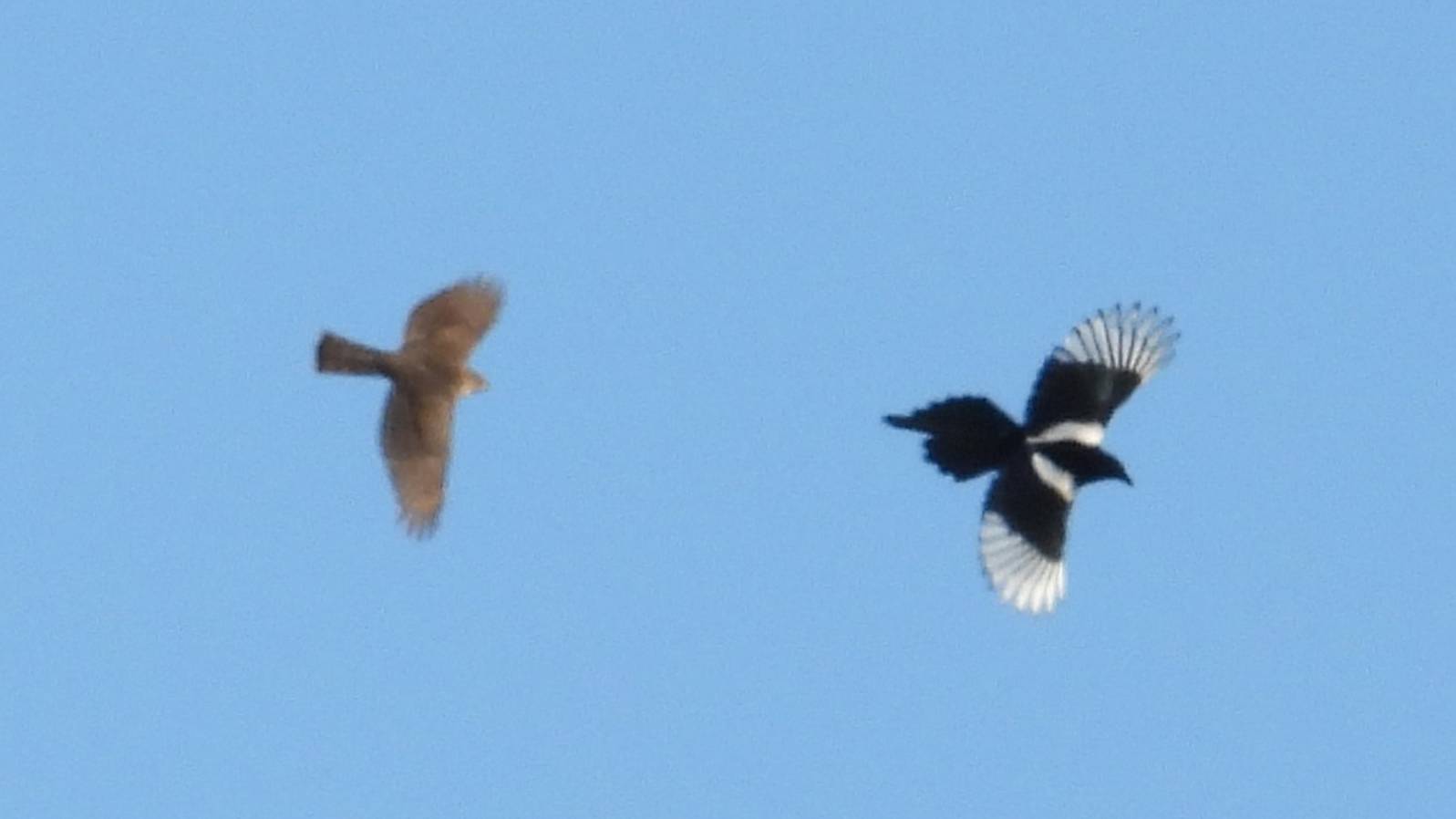 Сидел ястреб на дереве, никого не трогал. Сорока решила в одиночку облаять ястреба-перепелятника и даже клюнуть, и не рассчитала сил и наглости. Ястреб ловким маневром зашел ей со спины и по фото вижу что подпортил хвостик. Далее погнал её за деревья, чем дело кончилось не знаю. https://www.inaturalist.org/observations/266355366