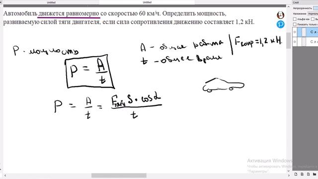 Автомобиль движется равномерно со скоростью 60 км/ч. Определить мощность, развиваемую силой тяги двигателя, если сила сопротивления движению составляет 1,2 кН. Основные понятия, затрагиваемые в видео: работа силы, мощность, равномерное движение.