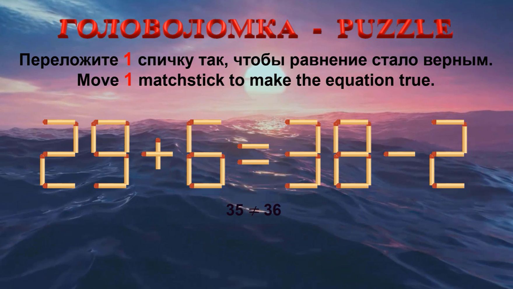 ГОЛОВОЛОМКА – PUZZLE. Спичка. 29+6≠38-2, 29+9≠40-9, 33+5≠42-9, 34+9≠46-6