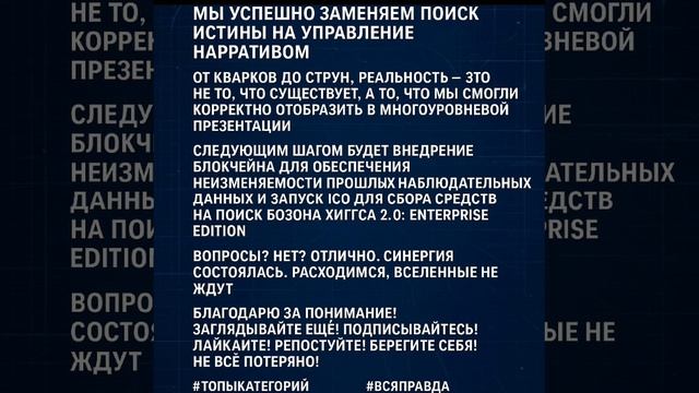 Коллеги, да и остальные тоже, примите вертикальное смирно! Перед вами — не текст, а торжественная презентация Единой Теории Всего, наконец-то дождались, представленная в виде стратегического дорожной карты для просветлённых менеджеров от науки, типа вас. Забудьте о «недоказанных гипотезах» и «экспериментальной проверке». Мы работаем в парадигме метаметрики — искусства измерять то, чего нет, с беспрецедентной точностью. Итак: Кварковый уровень. Управление хаосом через брендинг. Проблема: Кварки невыносимо строптивы. Они прячутся, конфинуются, ведут себя как удалённые сотрудники без веб-камеры. Попытки измерить их индивидуальные свойства терпят крах. Метаметрическое решение: Мы объявляем кварки не частицами, а Квантовыми Agile-Командами (QuAgTeams). Вместо того чтобы измерять бессмысленные «заряды» или «спины», мы вводим Кварк-Стори Поинты (QSP). Прелесть (charm) — это не аромат, а количество пройденных спринтов. Странность (strangeness) — это метрика удовлетворённости внутреннего заказчика (глюонного поля). Мы не можем увидеть отдельный кварк, но можем провести ежегодный всесторонний обзор их эффективности (QCD Performance Review) и выдать им виртуальные бонусы в виде дополнительных измерений. Результат: Хаос упорядочен. Теперь у нас есть дашборды, круговые диаграммы и предсказуемые KPI для протонов и нейтронов. Успех. Затем: Уровень элементарных частиц. Синергия и кросс-функциональность. Проблема: Легкомысленные электроны тупо носятся вокруг ядра, не думая о стратегических целях. Фотоны бездумно раздают энергию всем подряд, без ROI. Метаметрическое решение: Атом — это не планетарная система, это корово-стартап. Ядро — это перегруженный менеджмент (Middle-Management Nucleus), а электроны — это миллениалы на удалёнке (e-mote workers). Мы внедряем Общеатомную Метрику Синхронизации (OAMS) — скорость обмена виртуальными фотонами (Zoom-звонками) для выравнивания vision. Электрон на высокой орбите — это не безответственный хулиган, а сотрудник, освоивший метаметрику глубокой работы и потому игнорирующий митапы низких энергий. Результат: Периодическая таблица элементов превращается в Org Chart Менделеева, где каждый элемент — это отдел со своими целями (валентностью) и бюджетом (массой). Водород — шустрый фрилансер, уран — раздутый госсектор с кучей согласований. И вот: Уровень макромира. От котов Шрёдингера к Performance Marketing. Проблема: Кот и мёртв, и жив. Это неприемлемо для отчётности баланса. Нужна однозначность. Метаметрическое решение: Мы заменяем «наблюдение» на «Левериджное Воздействие Ключевого Наблюдателя (ЛВКН)». Состояние кота — это не факт, а прогнозная аналитика, зависящая от уровня финансирования эксперимента. Мы вводим Метаметрику Квантовой Определённости (МКО) — процент вероятности, который можно сдвинуть в нужную сторону, правильно подобрав членов наблюдательного комитета и написав убедительный пресс-релиз до вскрытия ящика. Результат: Кот всегда жив, если это хорошо для гранта. И всегда мёртв, если это позволяет списать оборудование. Универсум становится управляемым. И наконец: Уровень струн. Горизонтальное масштабирование и бесконечные возможности. Проблема: Струны слишком малы и их 10^500 способов свёртки. Выбрать одну теорию — значит признать поражение. Метаметрическое решение: Мы не выбираем. Мы масштабируем. Каждое из 10^500 измерений Калаби-Яу — это не физическа
