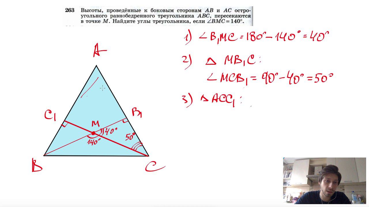 №263. Высоты, проведенные к боковым сторонам АВ и АС остроугольного равнобедренного треугольника ABC, пересекаются в точке М. Найдите углы треугольника, если ∠BMC= 140°. Поддержать канал рублём - 5469400944002125 (Сбербанк) Мой второй канал для подготовки к ЕГЭ и ОГЭ - https://www.youtube.com/ЕвгенийСумин Инстаграм - https://www.instagram.com/EGE_OGE.math Личный инстаграм - https://www.instagram.com/ee_sumin VK - https://vk.com/evgeniysumin FB - https://www.facebook.com/EvgeniySumin