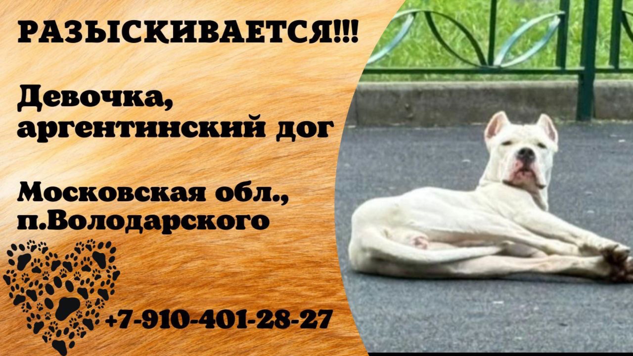 Московская Посёлок Володарского Пропала собака Пропала собака, Зелёная 39, Володарского Аргентинский дог, имеется клеймо. Добрая, но не дает себя поймать. Сука в течке. Перемещается между пос Володарского - дер Прудки - дер Редькино Порода питомца Аргентинский дог Пол питомца Женский Пропал(а) пт, 08.08.2025 Имя хозяина: Мария Телефон: 79104012827 Адрес: Зелёная улица, 39, посёлок Володарского Инфо: https://vk.com/wall-198815410_207632 #пропала_собака#московская#володарского
