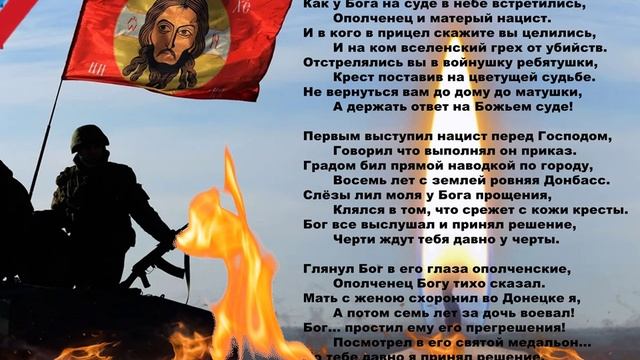 Небесный трибунал. Как у Бога на суде в небе встретились, Ополченец и матерый нацист. И в кого в прицел скажите вы целились, И на ком вселенский грех от убийств. Отстрелялись вы в войнушку ребятушки, Крест поставив на цветущей судьбе. Не вернуться вам до дому до матушки, А держать ответ на Божьем суде! Первым выступил нацист перед Господом, Говорил что выполнял он приказ. Градом бил прямой наводкой по городу, Восемь лет с землей ровняя Донбасс. Слёзы лил моля у Бога прощения, Клялся в том, что срежет с кожи кресты. Бог все выслушал и принял решение, Черти ждут тебя давно у черты. Глянул Бог в его глаза ополченские, Ополченец Богу тихо сказал. Мать с женою схоронил во Донецке я, А потом семь лет за дочь воевал! Бог... простил ему его прегрешения! Посмотрел в его святой медальон... По тебе давно я принял решение, И в небесный отпустил батальон! Лик Д.С.