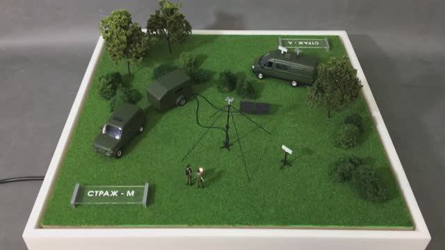 На макете отображены 2 тепловизионных комплекса "Страж А и М". Комплекс предназначен для круглосуточного визуального наблюдения территорий охраняемых объектов или рубежей охраны с помощью тепловизора и телекамеры дальнего обзора, установленных на поворотном устройстве. Изображения выводятся на монитор и одновременно производится их запись на жесткий диск ПК. На макете схематично отображен принцип работы данных комплексов. С помощью 2-х малооборотных двигателей происходит вращение радаров. Светодиоды вмонтированы в пассажирскую Газель и в ноутбук военного. ?️Масштаб 1-43 ?️Габариты 550х550мм ?️Механика ?️Светодиодная подсветка ?️Борта подмакетника из искуственного акрилового камня ?️Срок изготовления 2 недели Другие наши работы вы можете посмотреть на сайте - ros-model.ru Если вам требуется заказать макет или инсталляцию отправьте запрос на почту - ros-model@mail.ru